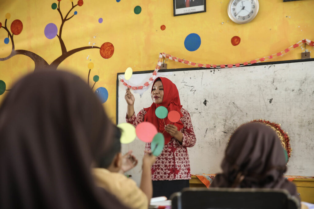 Mrs. Astuti, 39, uses teaching tools made from bamboo waste, cardboard, and cork to teach students mathematics. This local solution address learning challenges for students in remote area such as Sumbawa. Written by: Junaedi Uko