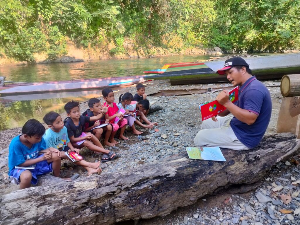 The riverside has always been Pak Otnel’s favorite spot in Lung Simau Village. With its refreshing ambiance amidst nature, this area is situated quite close to his residence. Surrounded by a pile of children’s reading books he has brought, he finds it pleasing to read storybooks to his students.