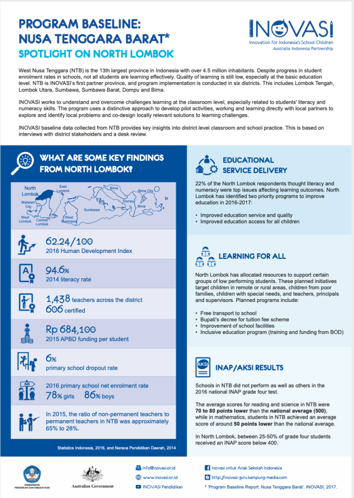 This infographic provide key insights from a baseline study into district level classroom and school practices in North Lombok, NTB.