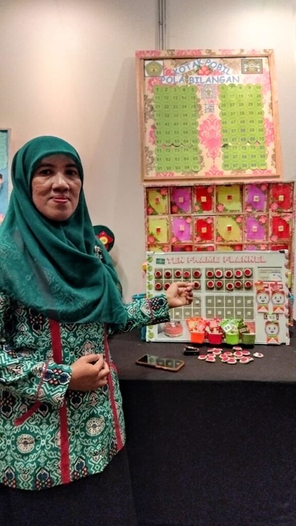 Being in contact with the numeracy program from September 2021 to March 2022 made this teacher of MI Tanwirul Afkar create media made from flannel. Luluk and two of her institute colleagues participated in a training consisted of five presentations and one mentoring session which then motivated them to be creative. Evidently, the media made by Luluk are able to increase interest in learning and make the learning atmosphere more comfortable. Ten Framel Flanel is the embodiment of a 10 frame but made more attractive by making frames made of flannel. Students can more easily use the media and it is more interesting. “If the objects we make as props are interesting, children will learn more happily and comfortably,” said Luluk.