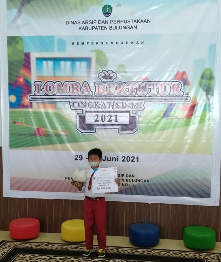 Muhammad Iksan, an 11 year-old fifth grade student of 013 Buluh Perindu Public Primary School in Tanjung Selor, Bulungan District, North Kalimantan stood in front of a crowd. At least a hundred people was watching Iksan, as he is usually called, tell a story. With confidence, the fifth grader carefully articulated a story about protecting the environment. His facial expression was serious, deeply engaged in the story he was telling. Iksan was a part of a folklore storytelling competition hosted by the Library and Achives Office of Bulungan District on 29-30th June 2021. The competition was a part of Bulungan District government’s campaign to increase reading interest among school children in the district.