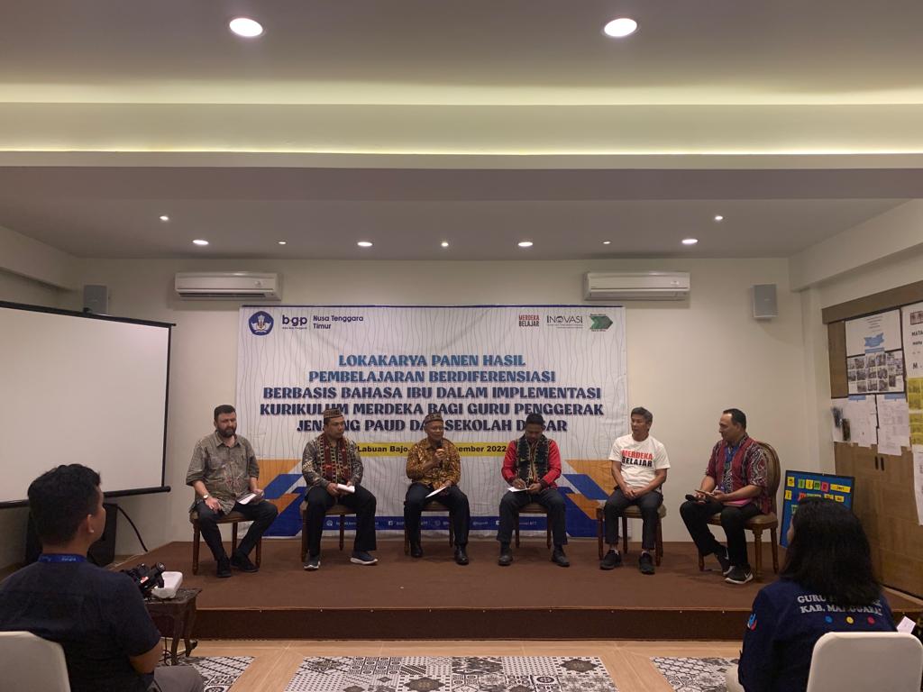 Balai Guru Penggerak (the teacher training agency) in East Nusa Tenggara (BGP NTT) held the Workshop on Harvesting Mother Tongue-Based Differentiated Learning Outcomes in the Implementation of Kurikulum Merdeka (IKM) for Guru Penggerak (change agent teachers) in early childhood development and elementary schools on 15-16 December in Labuan Bajo. This workshop was a continuation of the Guru Penggerak Workshop on 7-11 November in Kupang which was attended by Guru Penggerak from Manggarai and West Manggarai districts as well as teachers from Sekolah Penggerak in East Manggarai. For one month after the workshop in November, BGP together with INOVASI and the Sulinama Foundation actively conducted mentoring sessions for Guru Penggerak to carry out concrete actions. The teachers carried out an assessment of students’ literacy skills and used the results to design differentiated learning strategies and implement them to improve students’ literacy skills. A number of Guru Penggerak also designed learning strategies with their mother tongue content as the language transition.