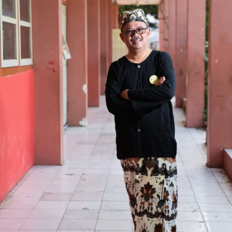 Rudianto, Kepala KLASA Cerbon (komunitas Literasi Ana Sekolah Andalan) Komunitas literasi anak sekolah berfoto di SDN 2 Weru Kidul, sebuah sekolah dasar di Kecamatan Weru, Cirebon, Jawa Barat, Indonesia, pada 5 September 2024. © Foto oleh Edy Purnomo / Paladium