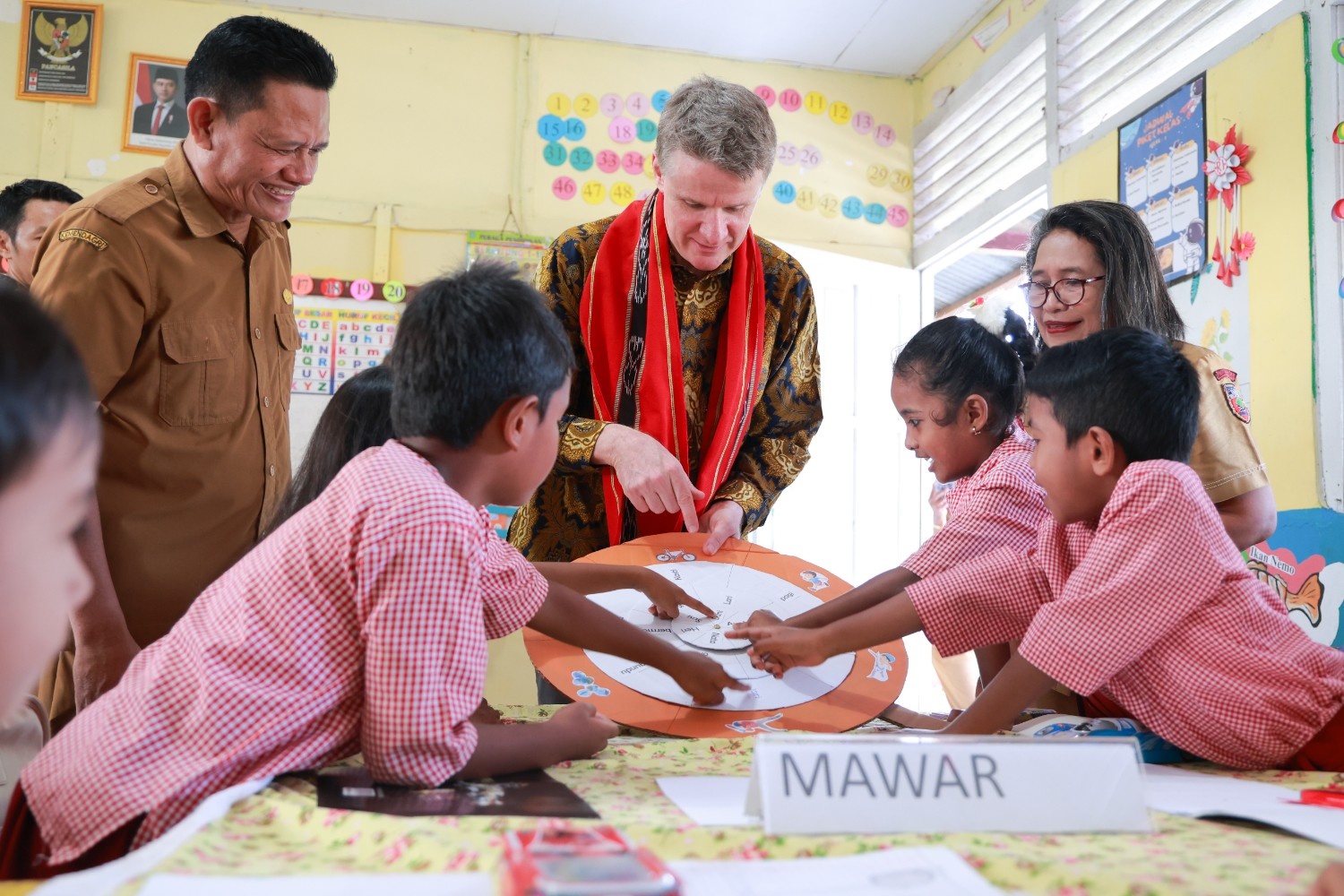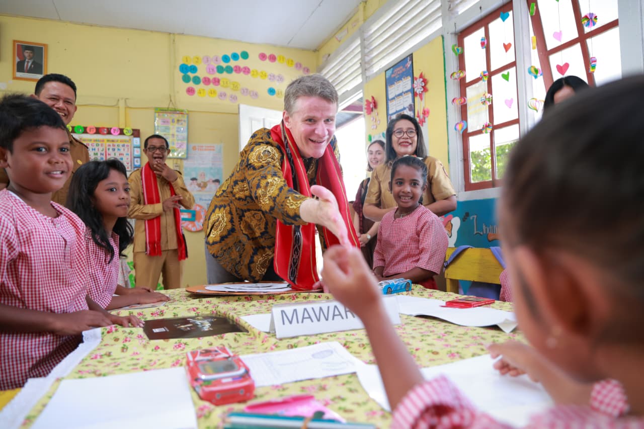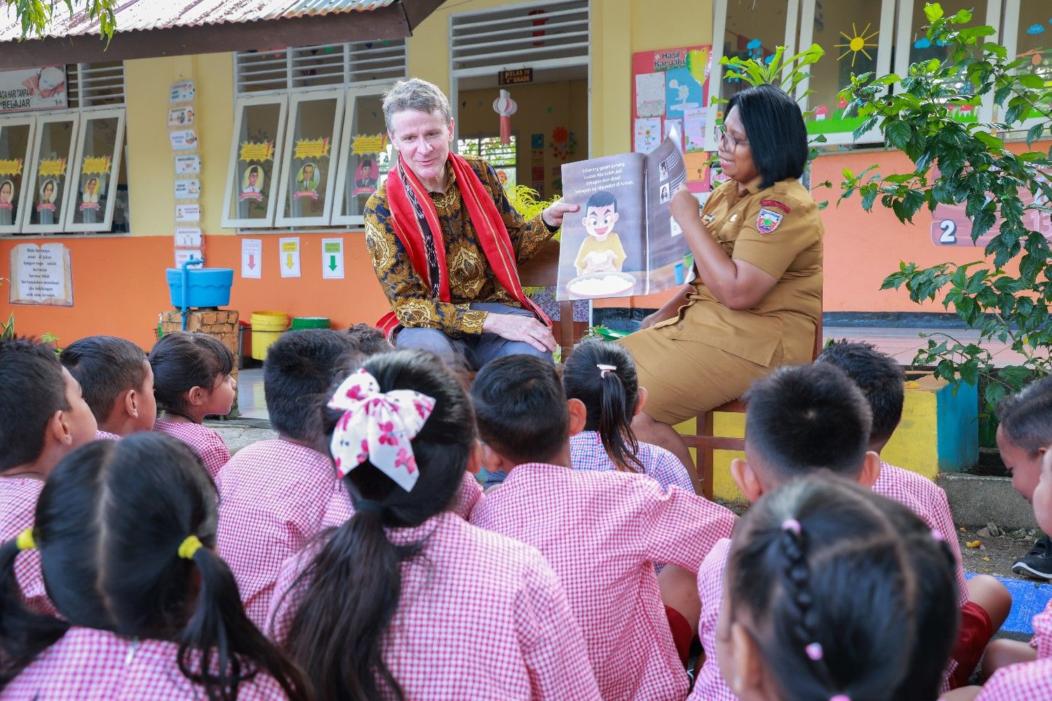 Dubes Australia untuk Indonesia, Rod Brazier, menggunakan media pembelajaran literasi bersama siswa-siswi kelas 1 di SD Negeri 216 Maluku Tengah. Dukungan INOVASI dan ekosistem pendidikan telah membantu sekolah ini dalam meningkatkan capaian literasi, numerasi serta pendidikan karakter.