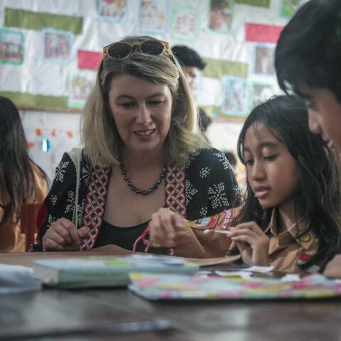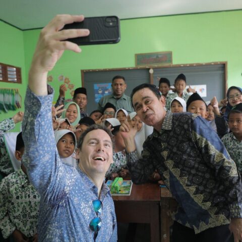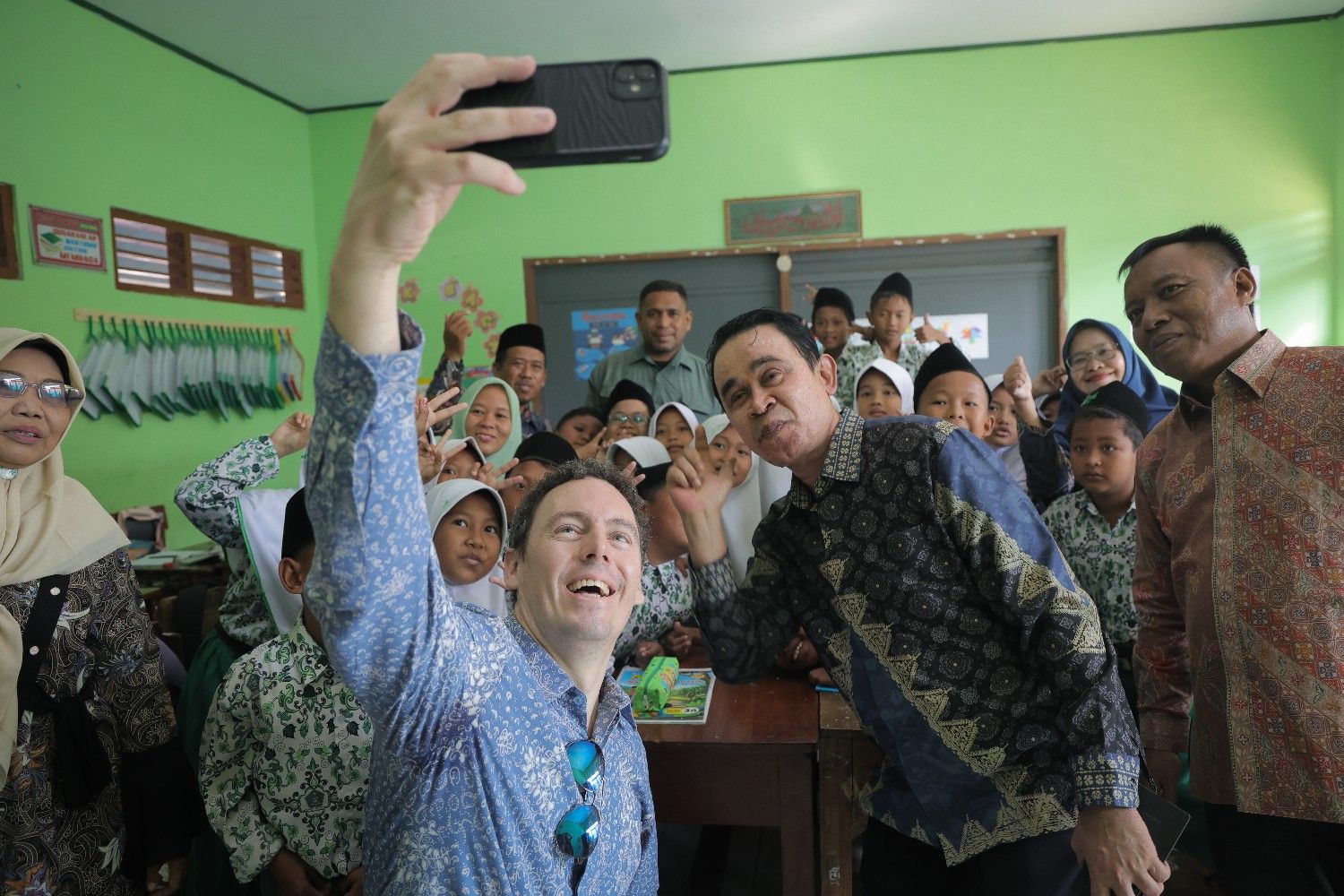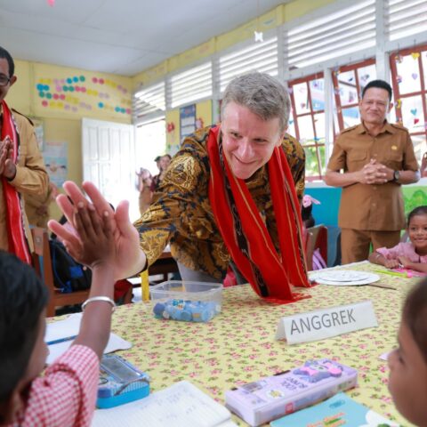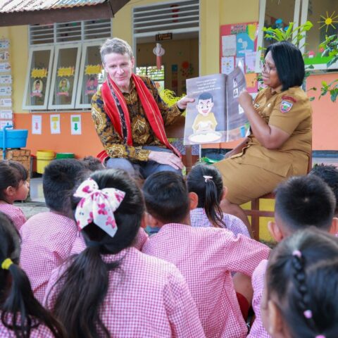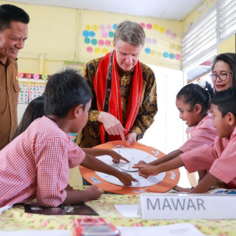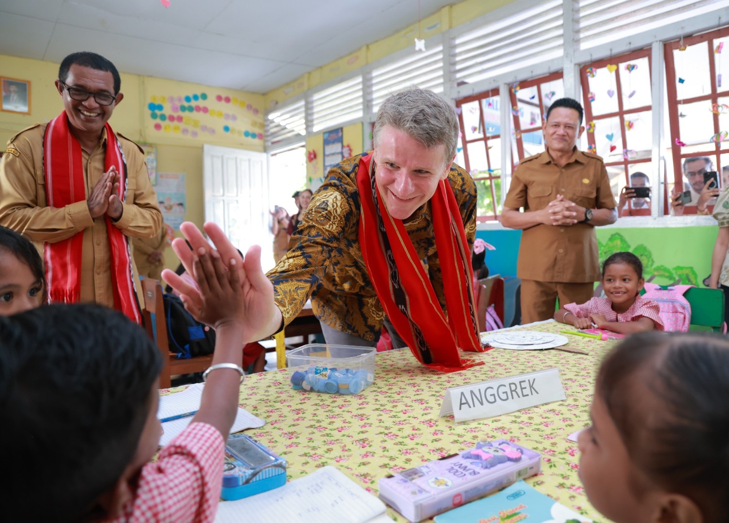 Dubes Australia untuk Indonesia, Rod Brazier, menggunakan media pembelajaran literasi bersama siswa-siswi kelas 1 di SD Negeri 216 Maluku Tengah. Dukungan INOVASI dan ekosistem pendidikan telah membantu sekolah ini dalam meningkatkan capaian literasi, numerasi serta pendidikan karakter.