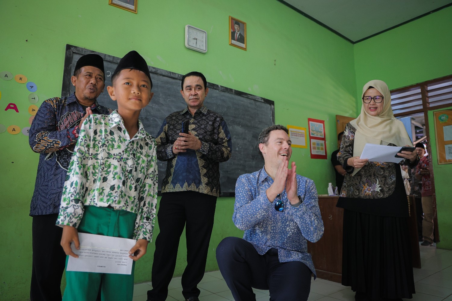 Tim Stapleton, Minister Counsellor Tata Kelola dan Pembangunan Manusia dari Kedutaan Besar Australia, memberikan apresiasi pada seorang siswa MIS Assuniyah 3 yang baru saja menuntaskan bacaannya. Dukungan program INOVASI pada madrasah ini telah berhasil meningkatkan capaian literasi dasar siswa-siswinya.
