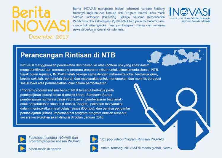 Informasi terkini seputar Inovasi untuk Anak Sekolah Indonesia (INOVASI), program kemitraan Pemerintah Indonesia dan Australia dalam meningkatkan mutu pendidikan. Bermitra dengan Kementerian Pendidikan dan Kebudayaan, INOVASI berupaya menemukan cara-cara yang terbukti berhasil (dan tidak berhasil) dalam meningkatkan hasil pembelajaran literasi dan numerasi siswa Indonesia di jenjang pendidikan dasar.