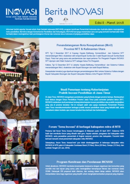 Informasi terkini seputar Inovasi untuk Anak Sekolah Indonesia (INOVASI), program kemitraan Pemerintah Indonesia dan Australia dalam meningkatkan mutu pendidikan. Bermitra dengan Kementerian Pendidikan dan Kebudayaan, INOVASI berupaya menemukan cara-cara yang terbukti berhasil (dan tidak berhasil) dalam meningkatkan hasil pembelajaran literasi dan numerasi siswa Indonesia di jenjang pendidikan dasar.