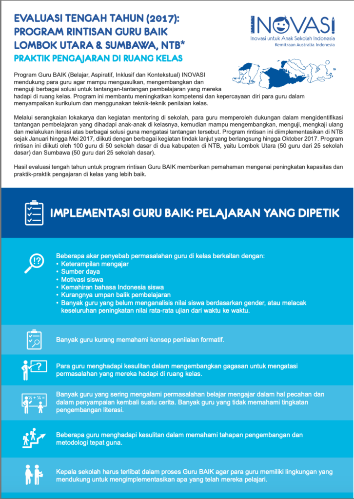 Hasil evaluasi tengah tahun program rintisan Guru BAIK memberikan pemahaman tentang peningkatan kapasitas dan praktik-praktik pengajaran ruang kelas di NTB.