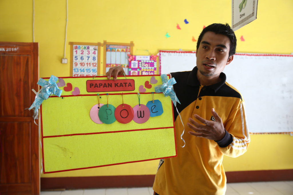 Belajar sambil bermain menggunakan “Papan Kata” adalah salah satu cara Sunardin untuk membantu proses pembelajaran siswanya. Pada papan kata tersebut ada sejumlah gambar dari sebuah benda atau kegiatan. Nantinya, anak-anak akan menyebutkan nama dari gambar benda atau kegiatan itu dalam bahasa Mbojo, bahasa yang kerap digunakan oleh masyarakat Bima. kemudian anak-anak akan diminta untuk menyusun kata dari benda atau kegiatan tersebut dengan menggunakan potongan-potongan huruf yang sudah ia siapkan.