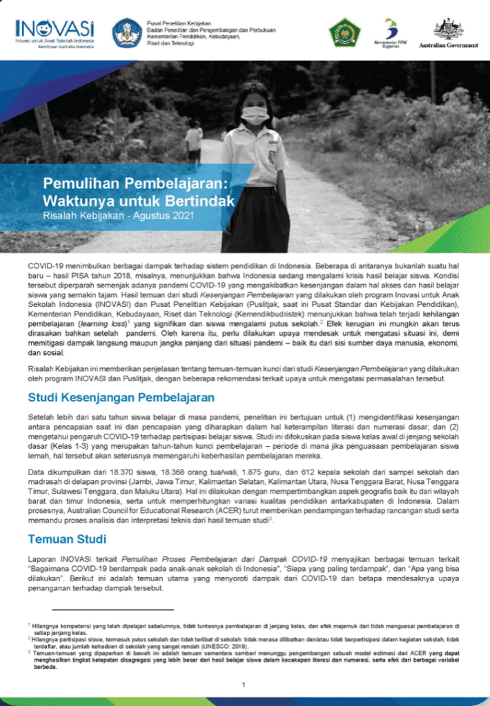 COVID-19 menimbulkan berbagai dampak terhadap sistem pendidikan di Indonesia, di antaranya terkait kesenjangan dalam hal akses dan hasil belajar siswa. Studi yang dilakukan oleh program Inovasi untuk Anak Sekolah Indonesia (INOVASI) dan Pusat Penelitian Kebijakan (Puslitjak), Kemendikbudristek menunjukkan bahwa telah terjadi kehilangan pembelajaran (learning loss) yang signifikan dan menyebabkan siswa mengalami putus sekolah. Risalah Kebijakan ini memberikan penjelasan tentang temuan-temuan kunci dari studi Kesenjangan Pembelajaran yang dilakukan oleh program INOVASI dan Puslitjak, dengan beberapa rekomendasi terkait upaya untuk mengatasi permasalahan tersebut.