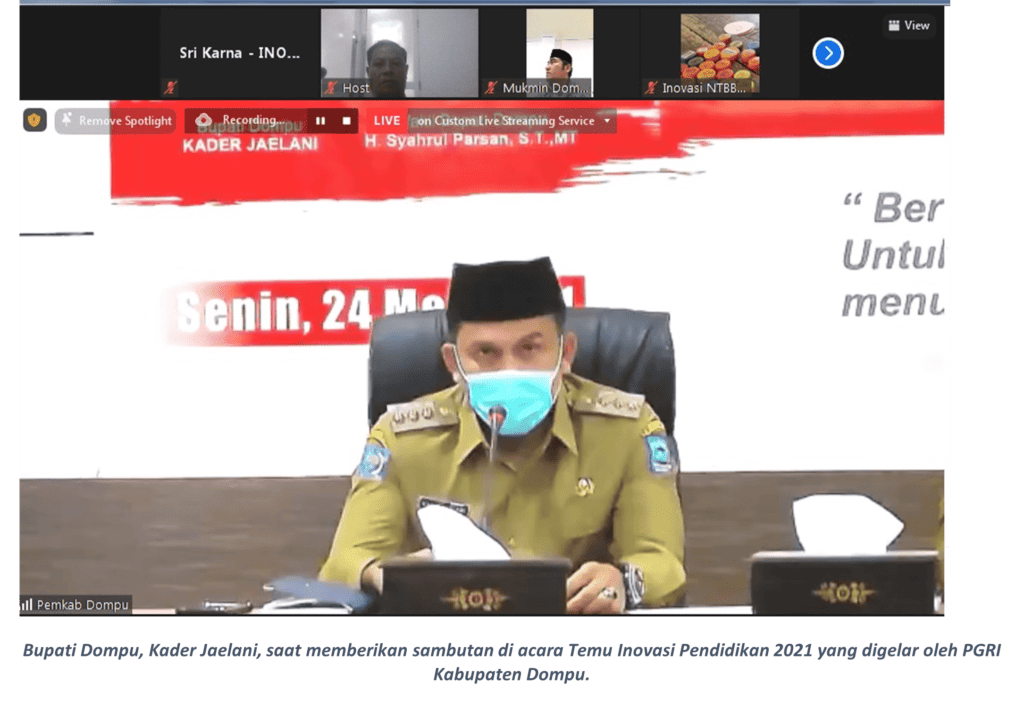 Memperingati Hari Pendidikan Nasional di bulan Mei 2021, Persatuan Guru Republik Indonesia (PGRI) Kabupaten Dompu dengan dukungan Dinas Dikpora Kabupaten Dompu dan Program INOVASI NTB menggelar acara Temu Inovasi Pendidikan Kabupaten Dompu. Kegiatan yang berlangsung secara daring ini diikuti oleh ratusan guru dan tenaga kependidikan dari berbagai sekolah. Bupati Kepala Daerah Kabupaten Dompu yang baru saja dilantik, Kader Jaelani, beserta jajarannya juga turut hadir secara daring. Turut hadir, Wakil Bupati H. Syahrul Parsan, ST., MT.