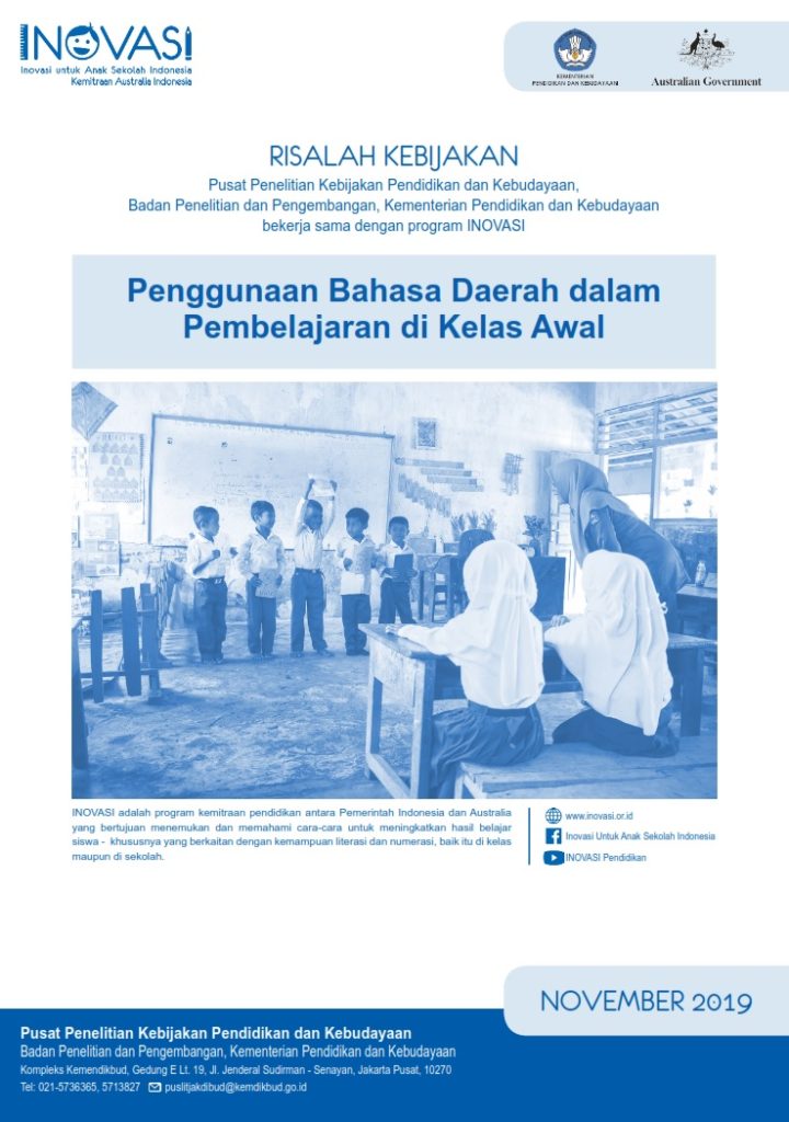 Risalah Kebijakan edisi Oktober 2019 ini mengeksplorasi isu-isu utama dan rekomendasi kebijakan tentang penggunaan bahasa Ibu dalam pembelajaran di kelas awal berdasarkan hasil pelaksanaan program INOVASI di Pulau Sumba, Nusa Tenggara Timur dan Kabupaten Bima, Nusa Tenggara Barat. Risalah Kebijakan ini akan diperbaharui pada akhir tahun 2019 dengan mengikutsertakan hasil studi endline pelaksanaan program.